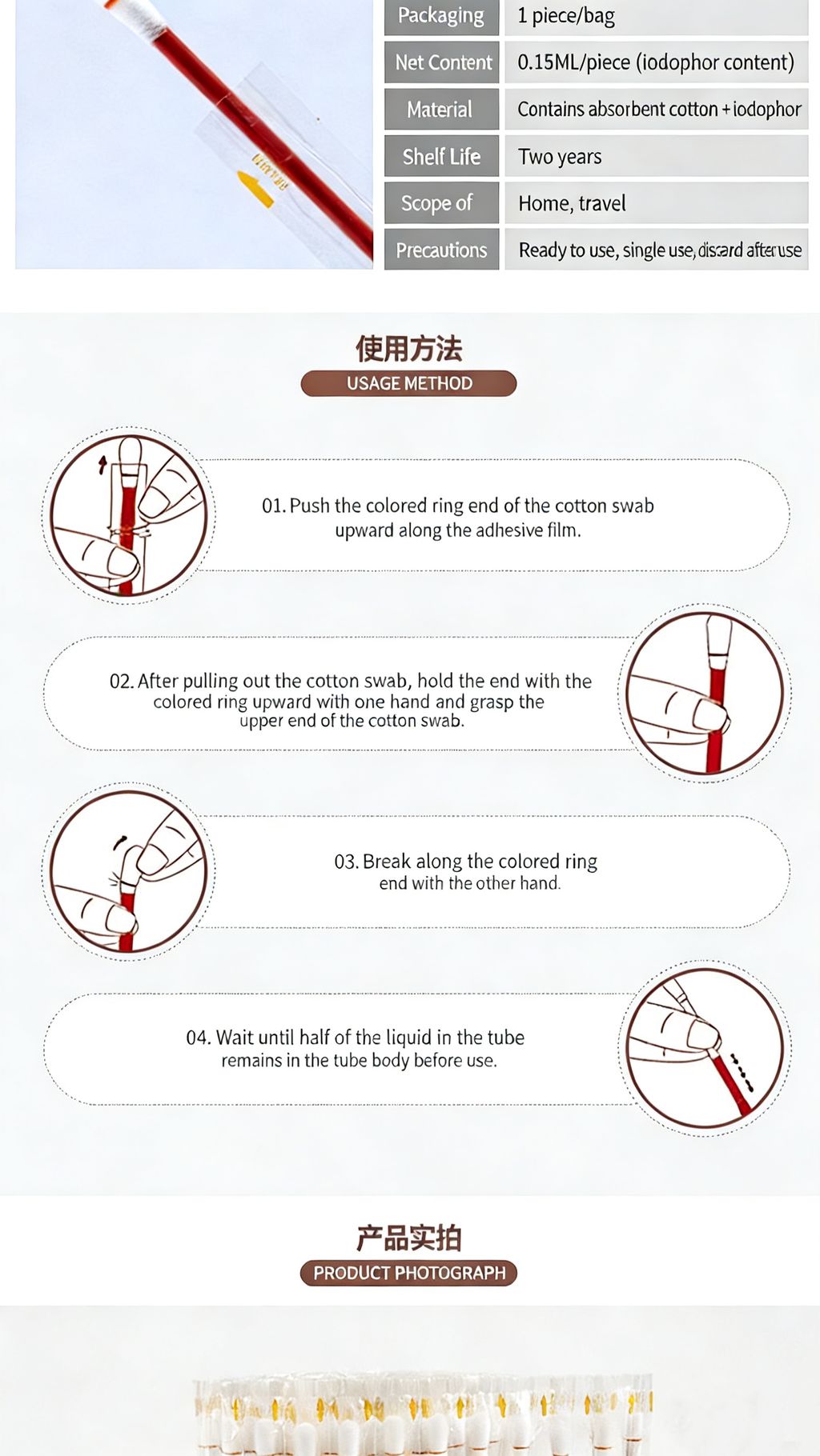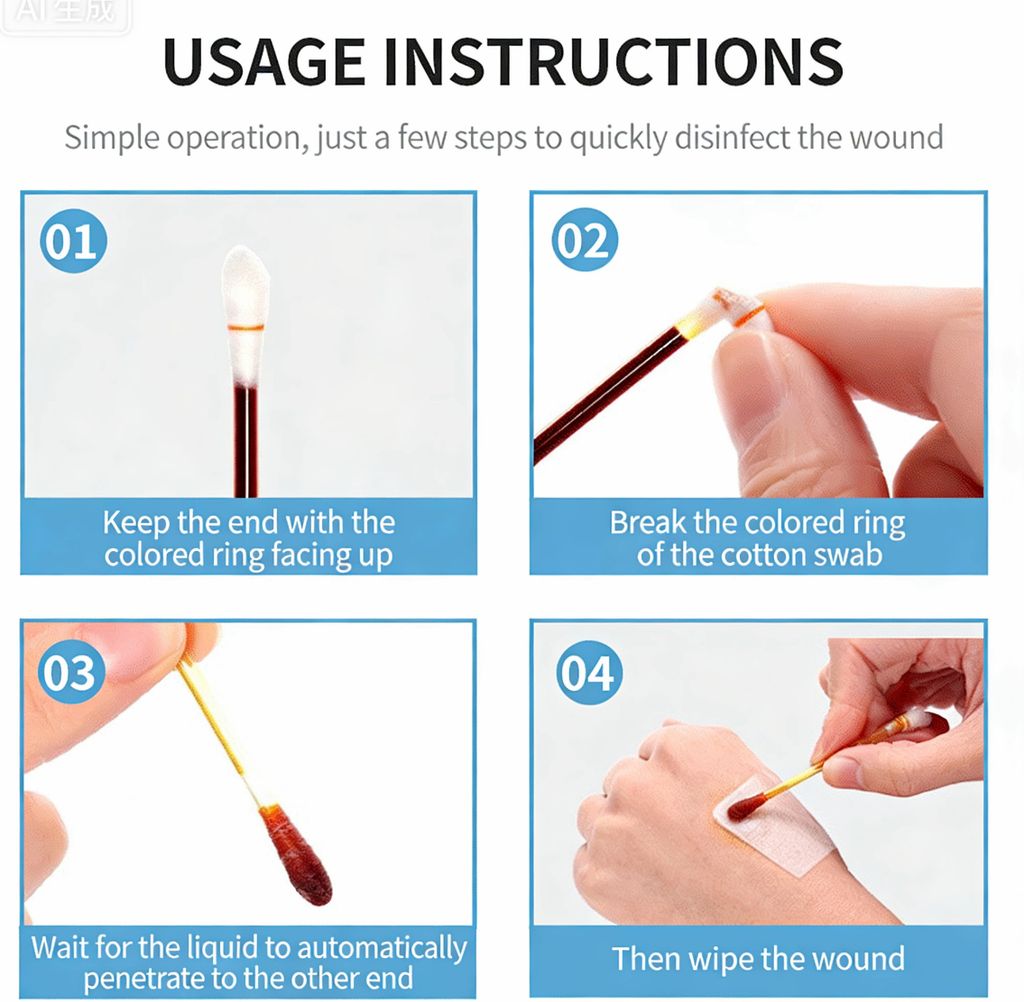 ✅ Pre-filled with medical-grade iodophor sealed inside the tube. Just snap, and the liquid flows evenly to the cotton tip.